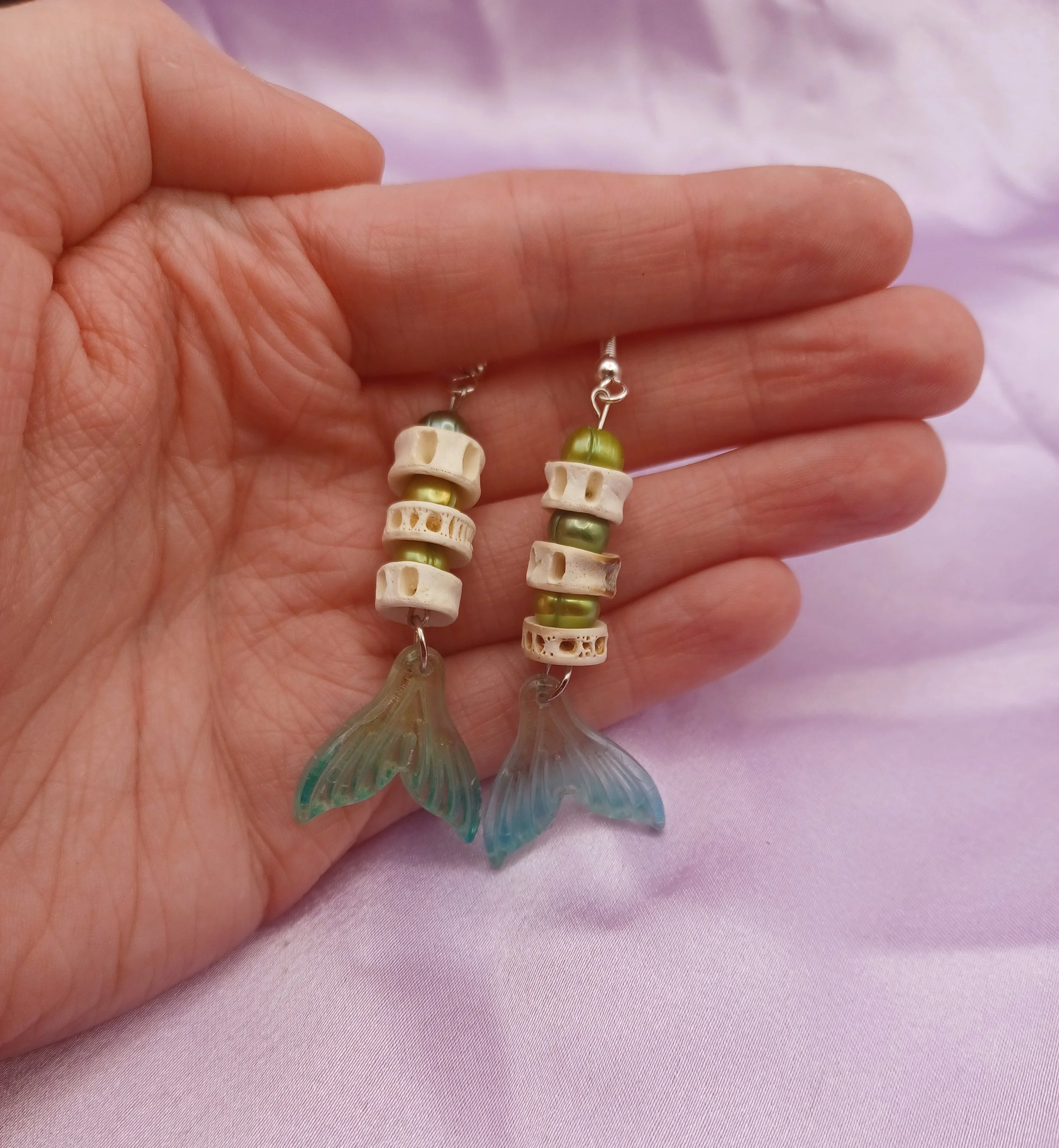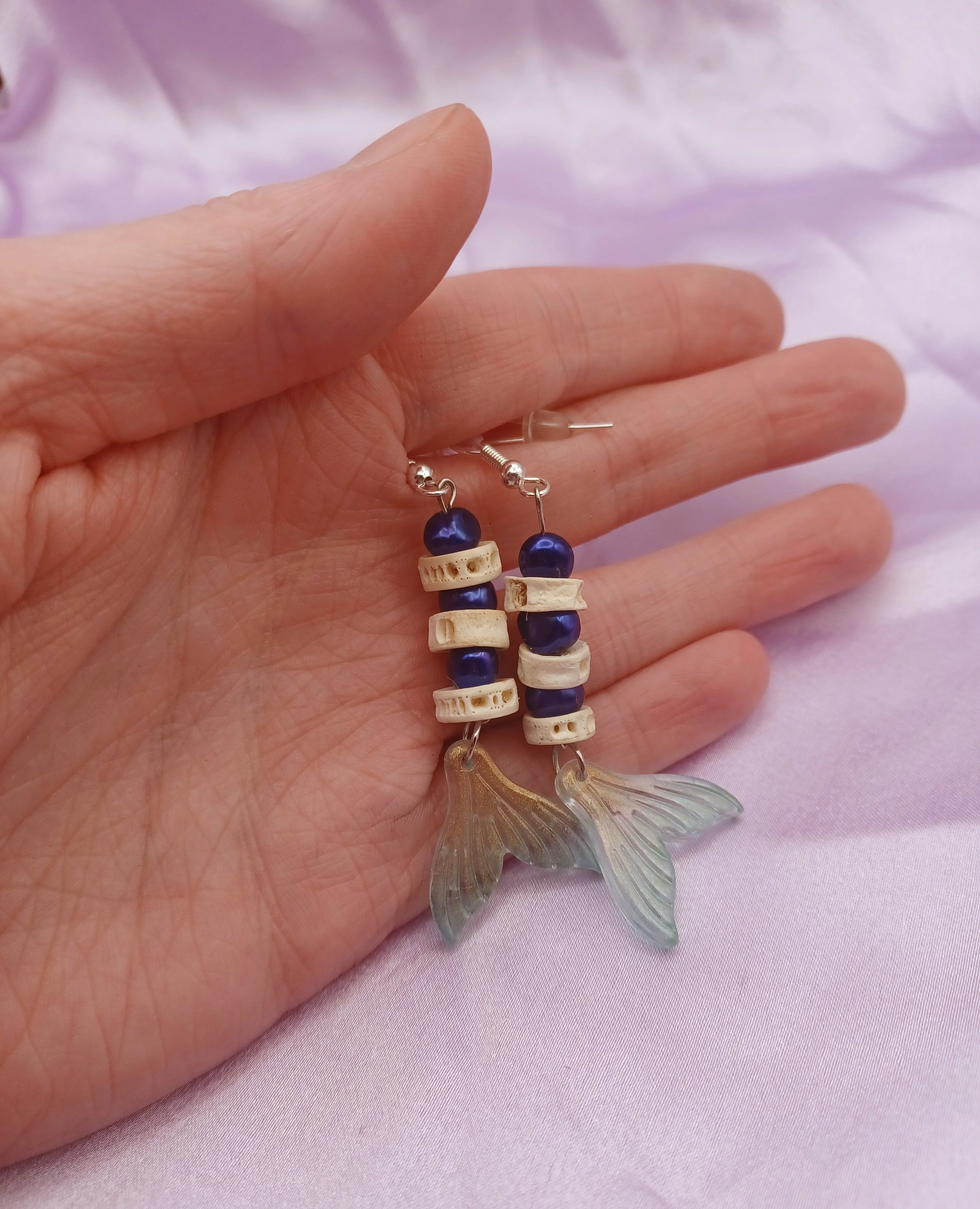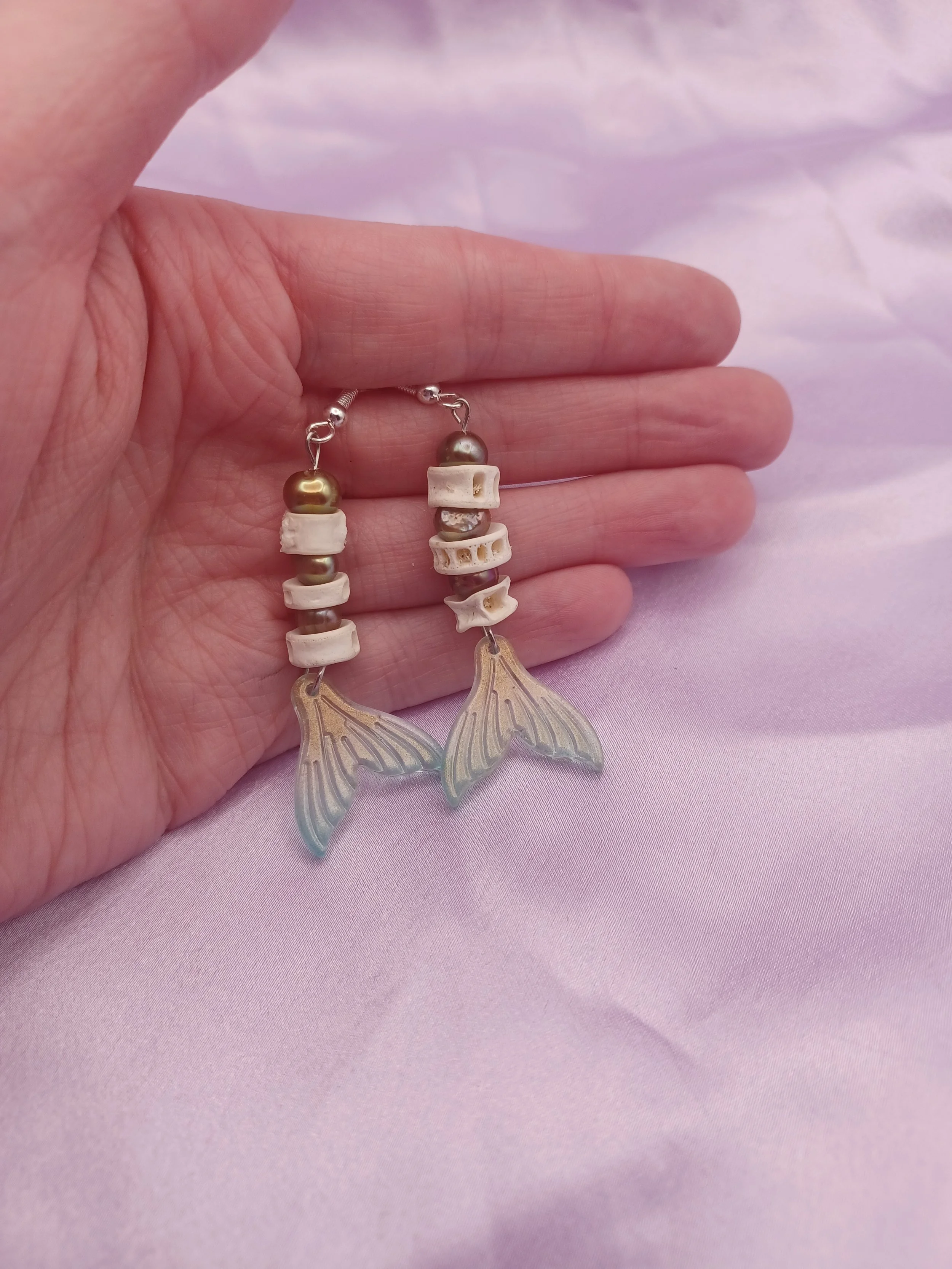 Beautiful fresh water pearls and South African fish spinal column, with a glass mermaid tail. Earrings are on hypoallergenic earring hooks