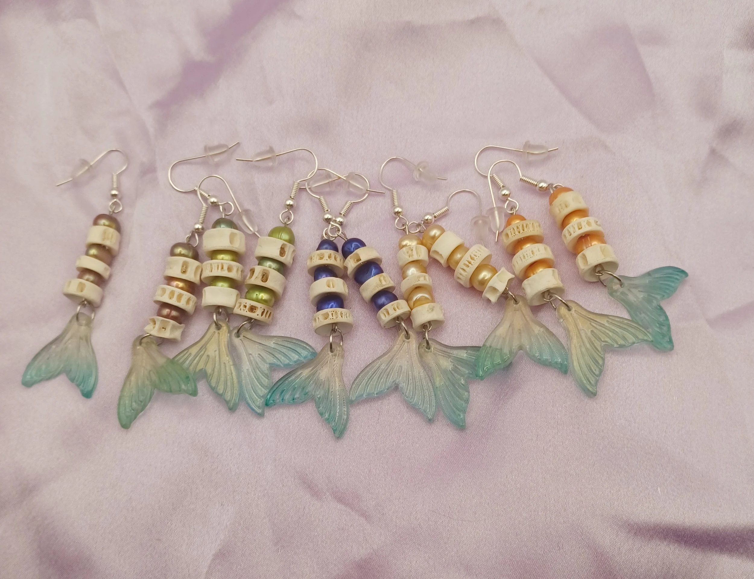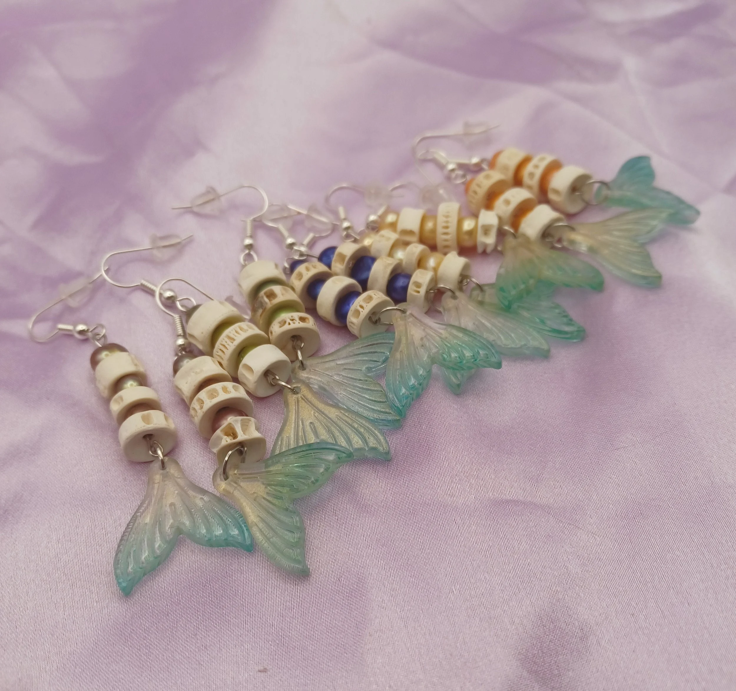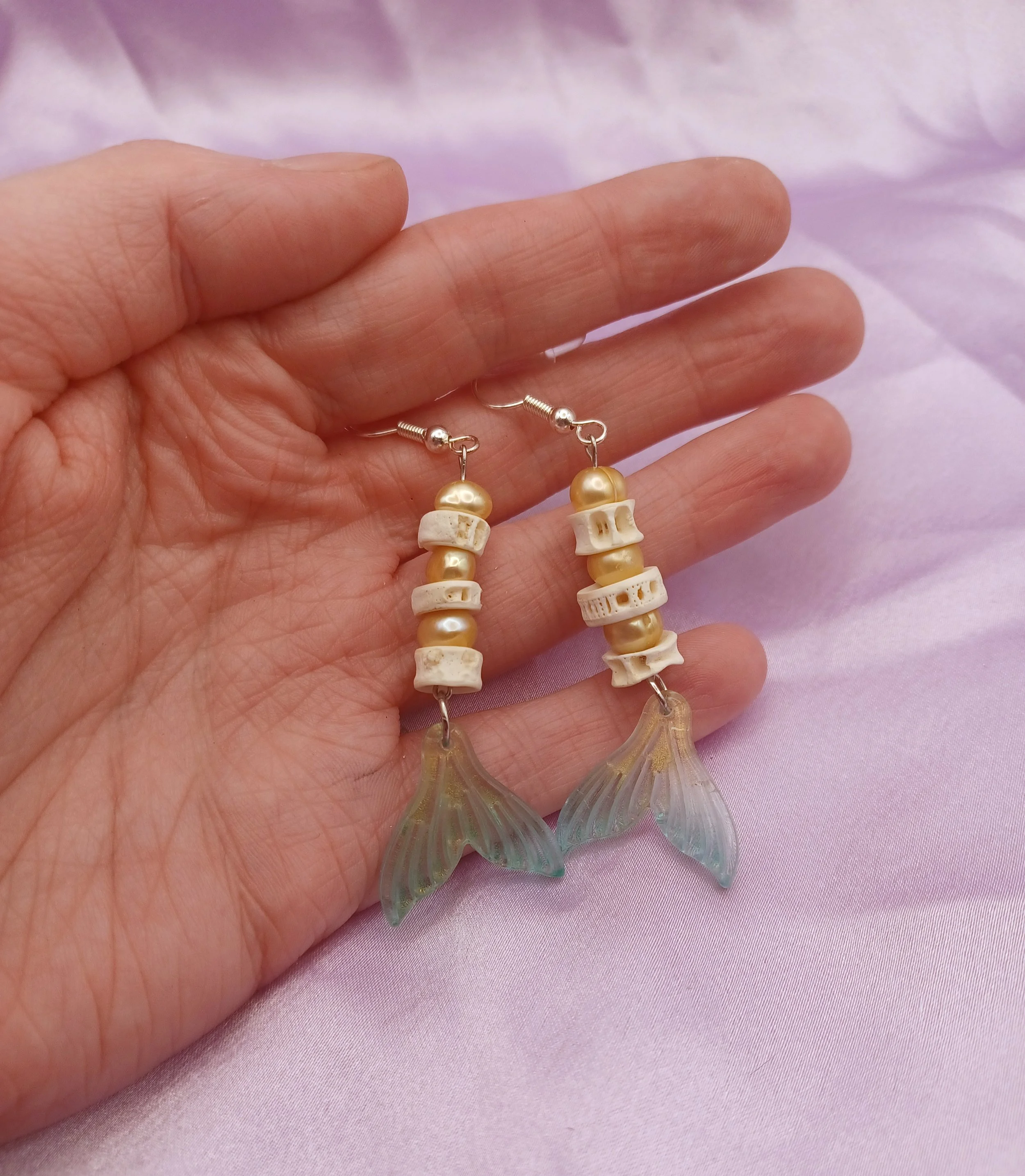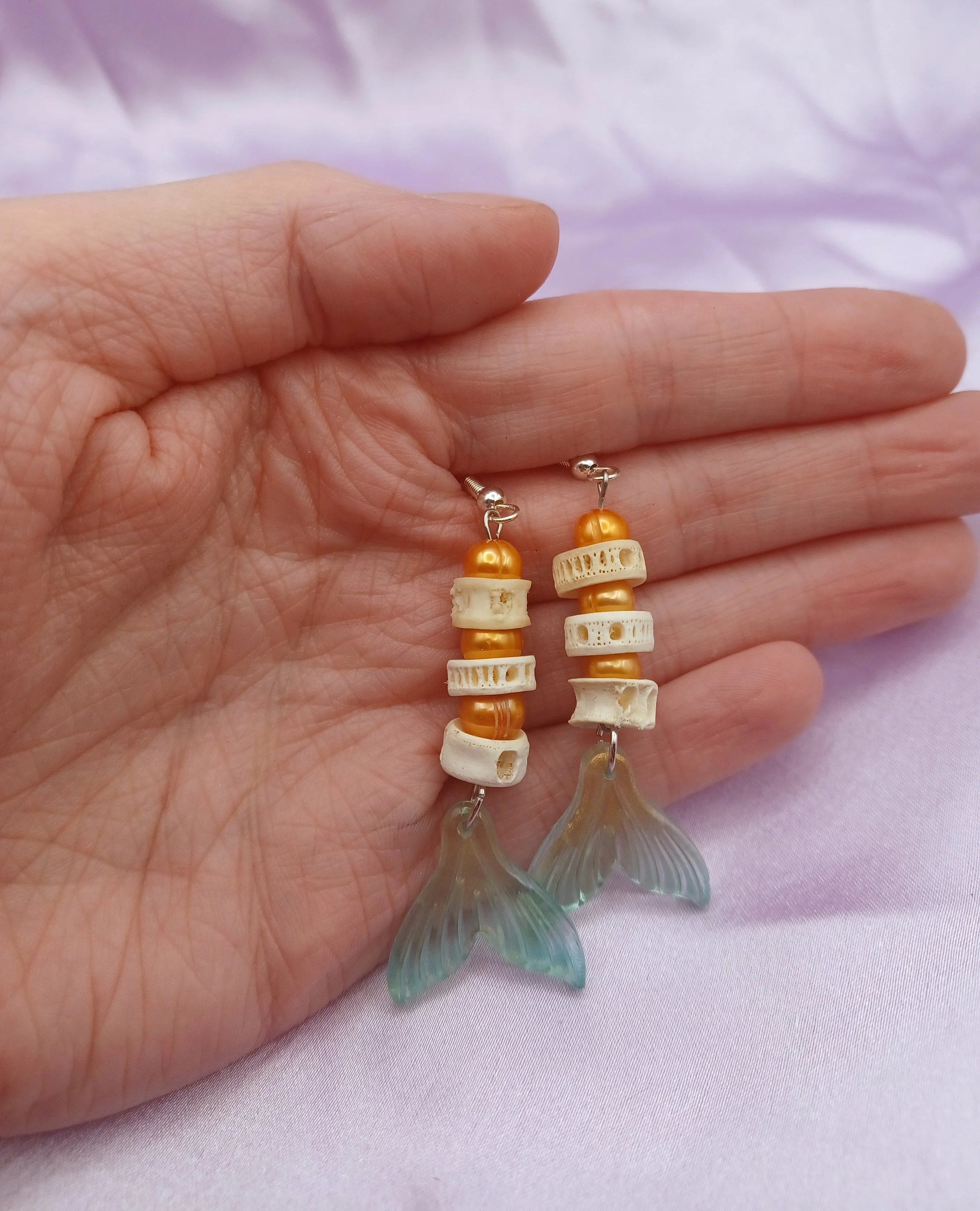 Beautiful fresh water pearls and South African fish spinal column, with a glass mermaid tail. Earrings are on hypoallergenic earring hooks