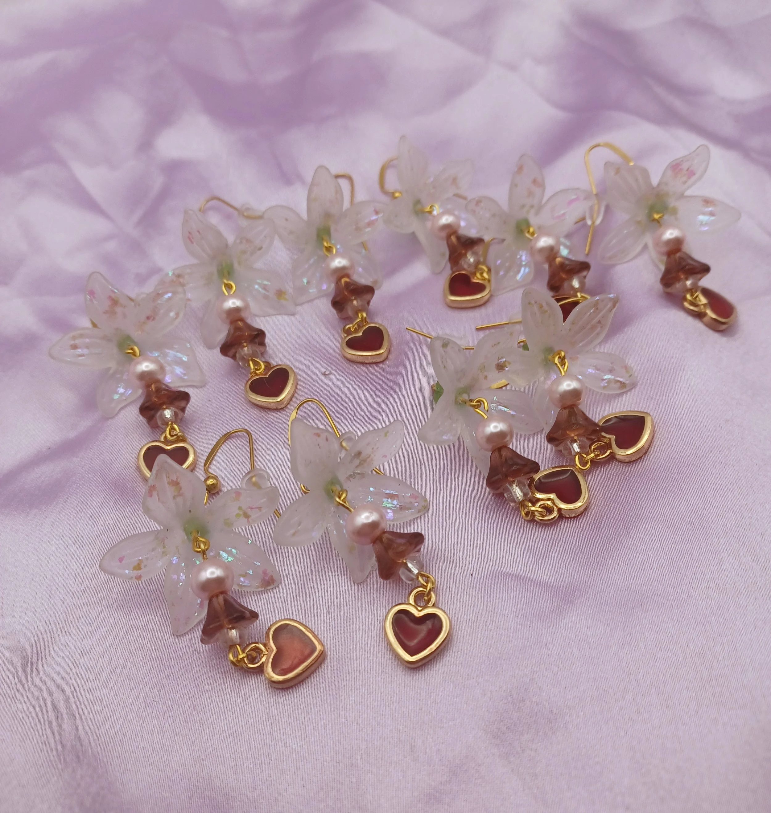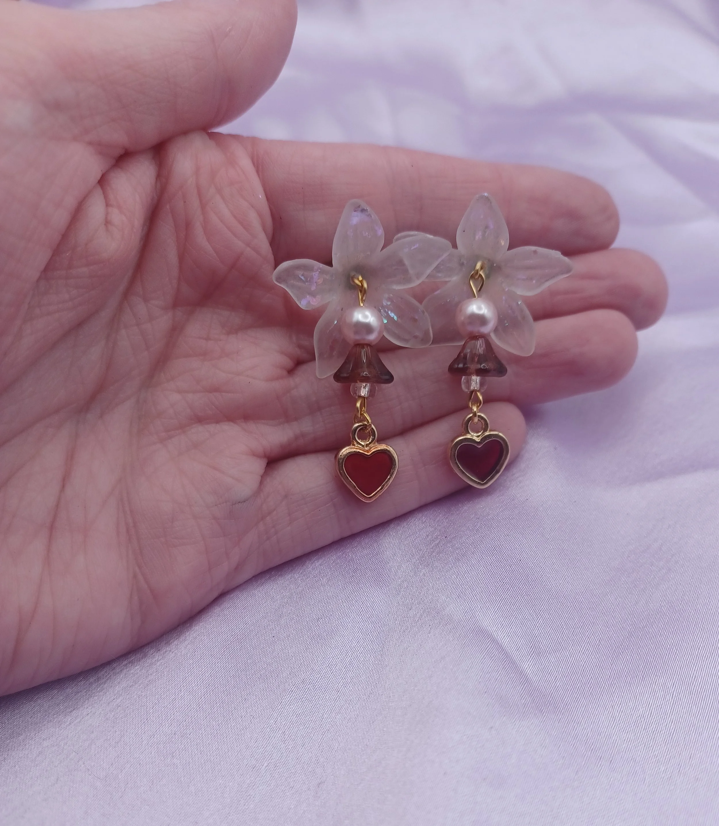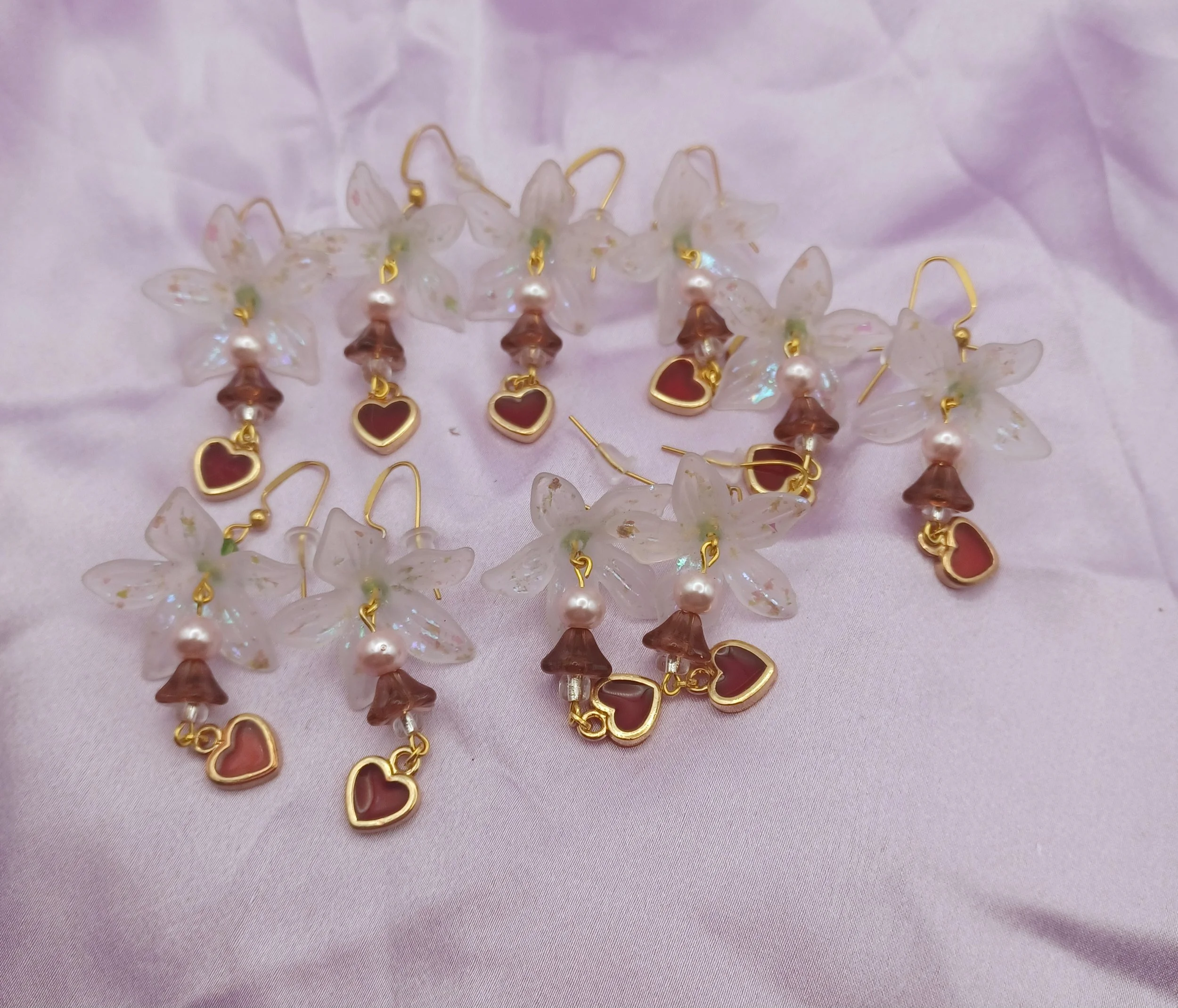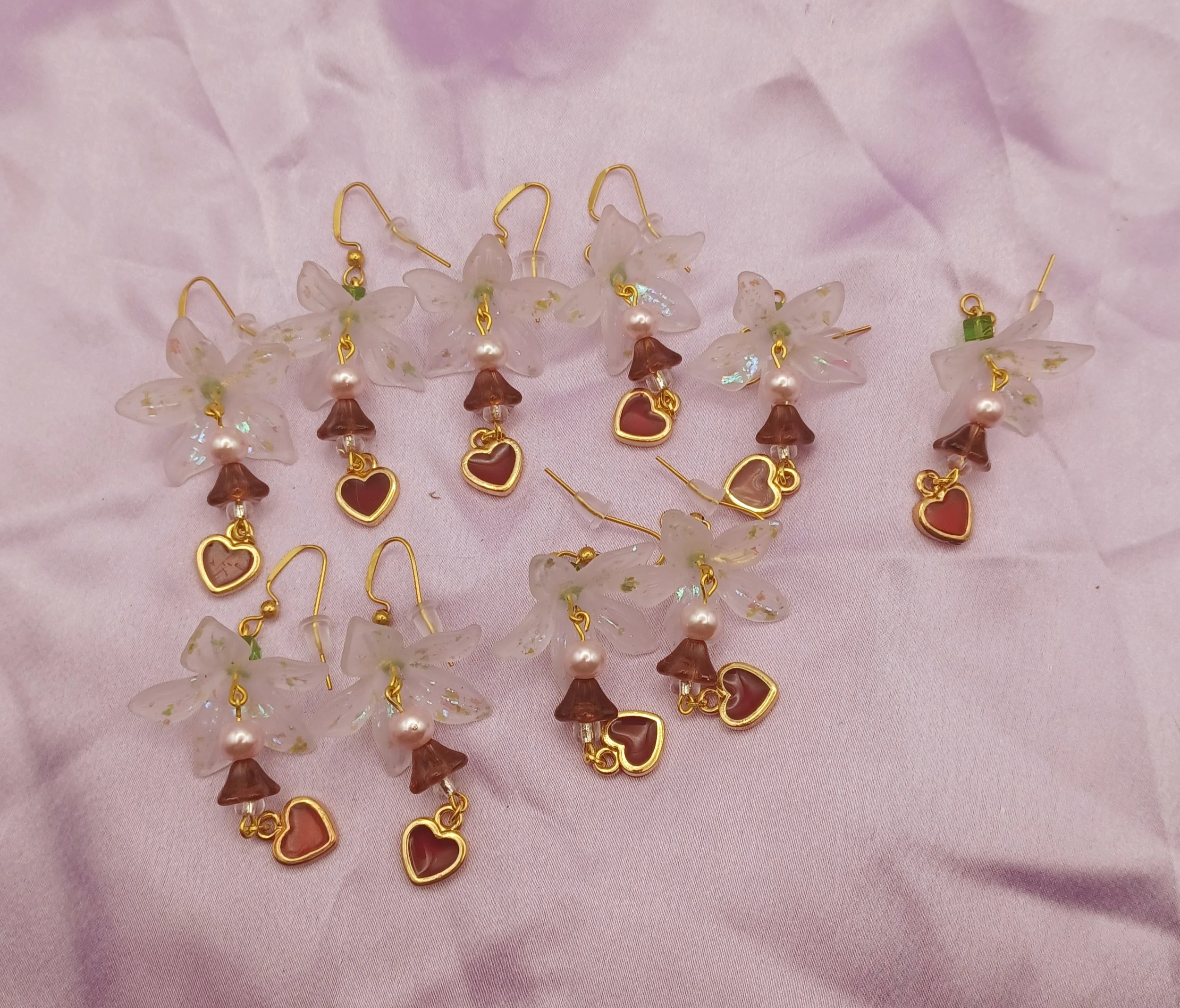 Floral transparent bead with varnish and duo chrome flakes, along with beautiful glass beads and peridot on top, earrings are on hypoallergenic gold hook earrings